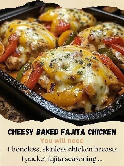 Here’s a tasty, crowd-pleasing Cheesy Baked Fajita Chicken recipe—juicy chicken with all the flavors of fajitas topped with melted cheese. 🌶️🧀