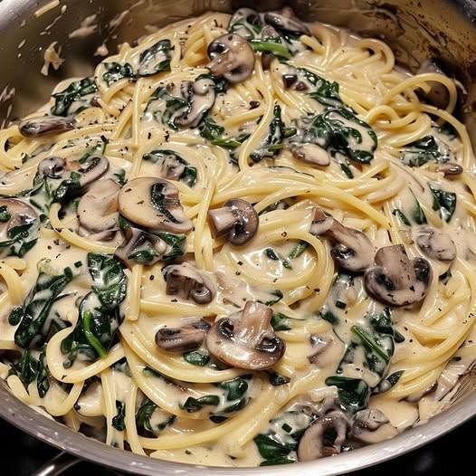 Here’s a Creamy Spinach and Mushroom Spaghetti recipe 🍝🌿🍄