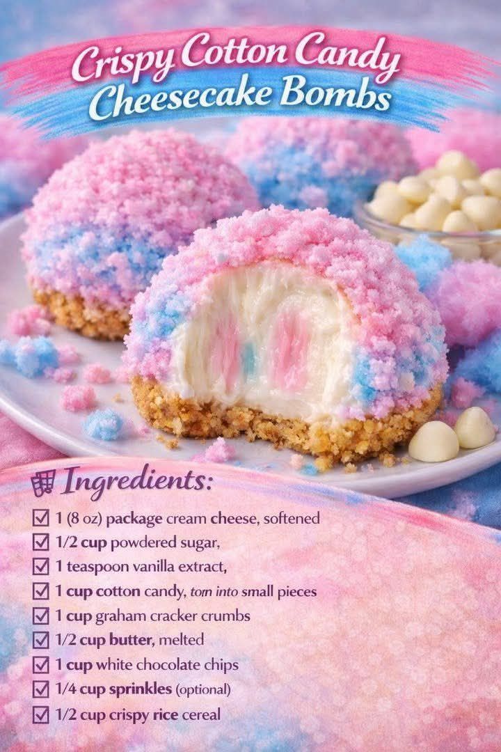 Here’s a fun and indulgent recipe for Crispy Cotton Candy Cheesecake Bombs—bite-sized, creamy on the inside, with a crunchy exterior and a whimsical cotton candy twist: