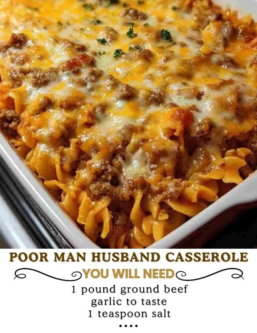 Ah! “Poor Man Husband Casserole” — that sounds like one of those funny, cozy, budget-friendly recipes with a clever name. Usually, dishes like this are hearty, simple, and made with whatever’s on hand. I can help you make a version if you want. Here’s a basic idea: