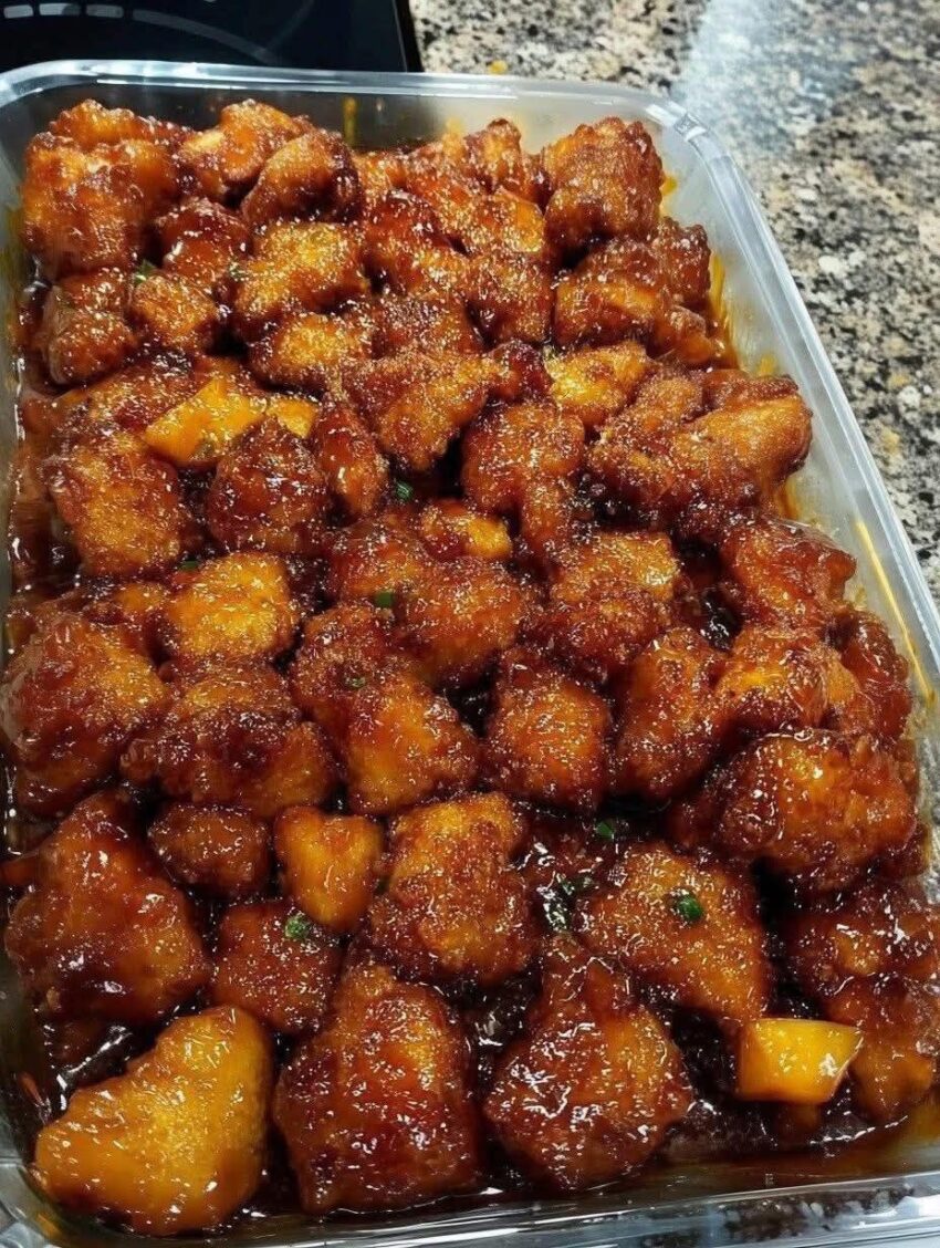 - Battered and fried chicken pieces coated in a glossy sweet-and-sour sauce.
